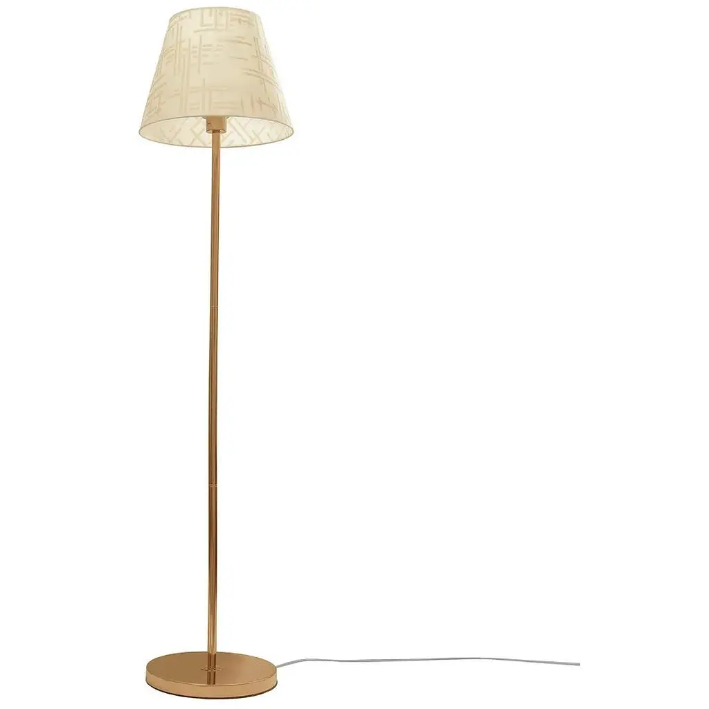 Торшер с абажуром BKL-647F/1 E27 FG можно поставить в гостиной возле дивана или в домашнем кабинете в зоне отдыха. Модель изготовлена из металла и ткани. Конструкция представлена металлическим круглым основанием золотистого цвета, ножкой и тканевым абажуром бежевого цвета. Ткань приглушает световой поток и делает освещение мягким и приятным. Для работы торшера необходима одна лампочка с цоколем Е27. Подойдет лампа накаливания, энергосберегающая или светодиодная. Выключатель находится на шнуре. Диаметр плафона – 340 мм, диаметр основания – 275 мм. Шнур изготовлен из силикона, его длина составляет 2380 мм.