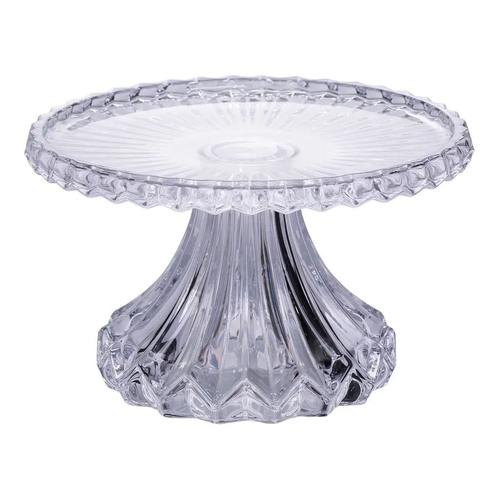 Эта тортовница на ножке изготовлена из прозрачного стекла с имитацией хрустального узора, что создает эффект лучистого сияния. Изделие имеет круглую форму с рельефным краем и гладкой центральной частью для удобного размещения тортов, пирогов или другой выпечки. Конструкция подразумевает поднятое основание, которое не только придает изделию стойкости, но и позволяет эффектно презентовать десерты на праздничном столе.