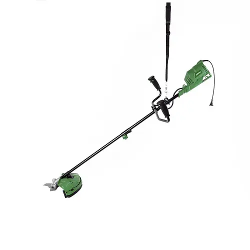 Тример полностью разборный. При хранении занимает мало места. Состоит из двух сборных частей штанги, на которую крепится рукоятка, похожая на велосипедный руль. Устанавливается она под рост пользователя. Наплечный ремень дополнительно помогает удерживать косу и направлять ее. Двигатель находится в верхней части штанги, а от него к рулю идет провод, чтобы можно было прямо на рукоятке включать устройство.