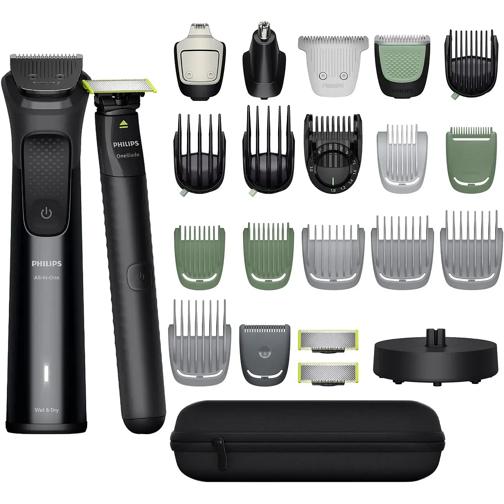 Philips Series 9000 MG9690/30 – это профессиональный комплекс по уходу, который сочетает триммер с металлическим корпусом и инновационный OneBlade. Лезвия с титановым покрытием самозатачиваются и обеспечивают стабильную точность во время стрижки. Технология BeardSense автоматически подстраивает мощность в зависимости от густоты волос, а 27 настроек длины позволяют работать как с короткой, так и длинной бородой. Модель поддерживает сухое и влажное использование, а мощный аккумулятор Li-Ion работает до 180 минут без подзарядки. Комплект из 25 инструментов расширяет возможности ухода за лицом, головой и телом.