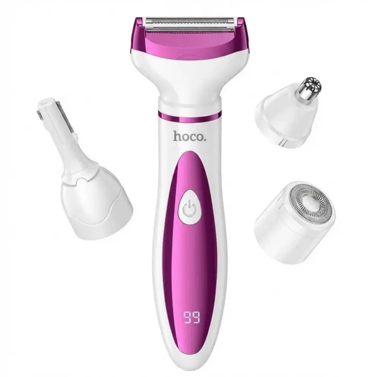 HOCO HP80 — стильный и многофункциональный женский триммер и бритва «4 в 1», созданный для комплексного ухода за телом и лицом. Это компактное устройство позволяет легко и эффективно удалять волосы с любых участков: бровей, носа, подмышек, ног и зоны бикини. Легкий и эргономичный корпус обеспечивает удобство использования, а цифровой дисплей показывает уровень заряда, напоминая о необходимости подзарядки.
