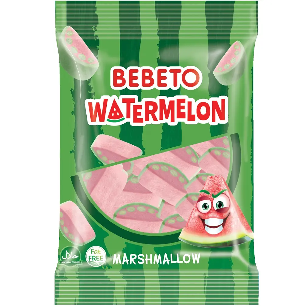 Конфеты-маршмеллоу Bebeto Watermelon - жевательный зефир-маршмеллоу со вкусом арбуза. Быстро насыщает организм энергией, так как содержит массу простых углеводов, подходит для перекусов в рабочее время, когда нет возможности полноценно пообедать. Участвует в восстановлении хрящей и суставов - этот процесс обеспечивается желатином, которого в маршмеллоу содержится достаточно много. Именно поэтому сладостями рекомендуют радовать людей с переломами, вывихами или ушибами костей. Не содержит пальмового масла.