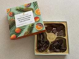 Купували по Акції "на пробу". За Акційну ціну - дуже гарна пропозиція. Сухофрукти у шоколаді сподобалися, шоколад у міру солодкий, у коробці у рівній пропорції курага, ананас, апельсин у шоколаді. На коробці апельсин зображений дольками, але по факту він іде смужечками, усі фрукти повністю у шоколаді. Гарний варіант на "презент".