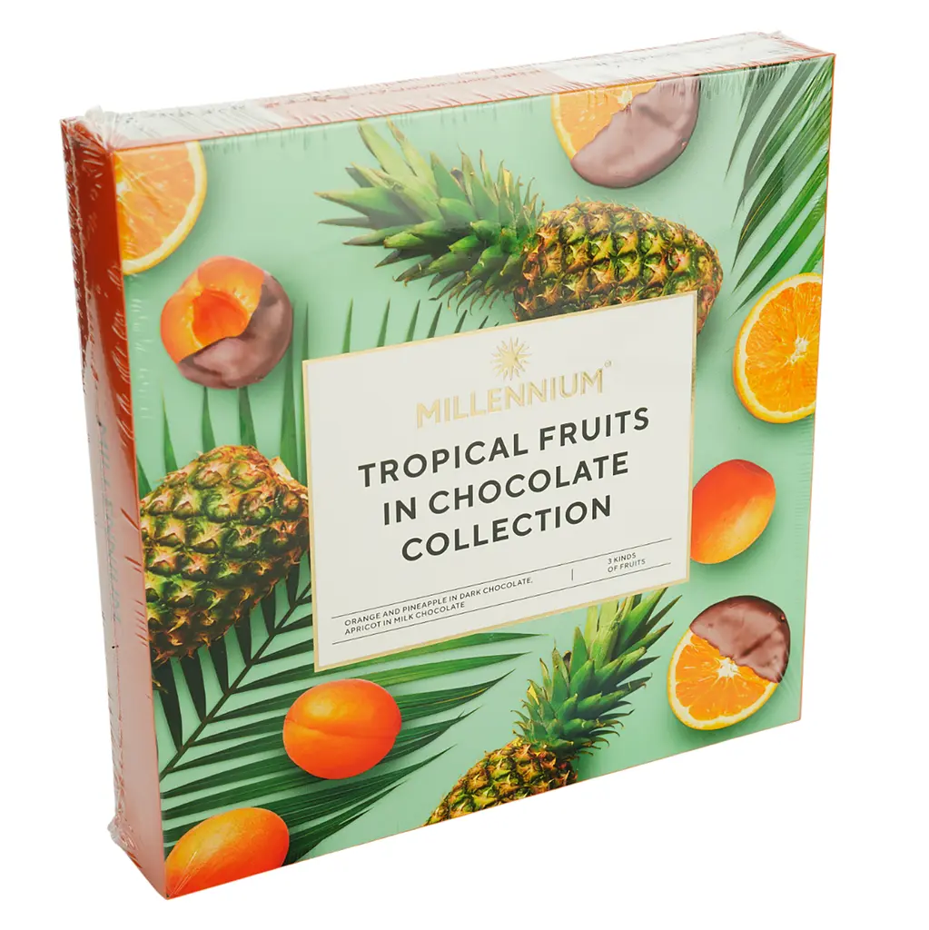 До конца акции 2 дняШоколадные конфеты Millennium Фрукты в шоколаде - яркая и увлекательная фруктовая коллекция, созданная из неповторимых сочетаний ананаса, апельсина и абрикоса в молочном и черном шоколаде.