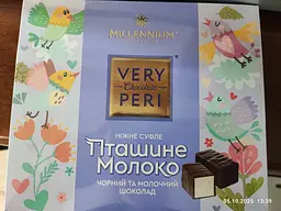 Цукерки Millennium Very Peri "Пташине молоко” це дуже ніжні та вишукані цукерки. Коробка поєднує цукерки вкриті чорним та молочним шоколадом. М’яка суфлейна начинка буквально тане в роті, смак не надто солодкий, що для мене є великим плюсом. Підійдуть як для себе до кави так в на подарунок!