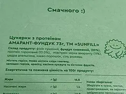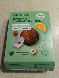 Цукерки Sunfill Амарант-фундук з протеїном мають насичений горіховий смак із легкою амарантовою ноткою. Відчувається користь натуральних інгредієнтів, хоча текстура та специфічний присмак можуть сподобатися не кожному. Гарний вибір для тих, хто шукає здорову й поживну альтернативу звичайним солодощам.