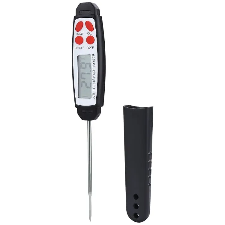 Использовать термометр очень просто, необходимо воткнуть щуп внутрь продукта и за считанные секунды на ЖК дисплее появится внутренняя температура продукта. А во время хранения измерительный щуп прячется в специальный чехол.