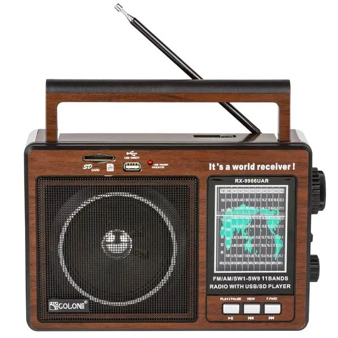 Радиоприемник Golon RX-9966 UAR – качественная радио и портативная акустика со встроенным аккумулятором 1800 мАч, USB и кардридером. Предназначен для воспроизведения MP3 и WAV файлов с USB-флешек и SD-карт, обеспечивая хорошее качество звука. Работает в качестве радиоприемника с частотами FM (87.5-108 МГц), AM (530-1710 кГц) и SW1-SW9 (4.75-22.0 МГц), а также в качестве медиаплеера. Воспроизведение осуществляется через один динамик размером 101 мм (4”) с механическим переключателем между радио и внешними носителями, кнопками для переключения треков на передней панели, механической регулировкой громкости и механическим поиском частот. или четырех батареек R20.