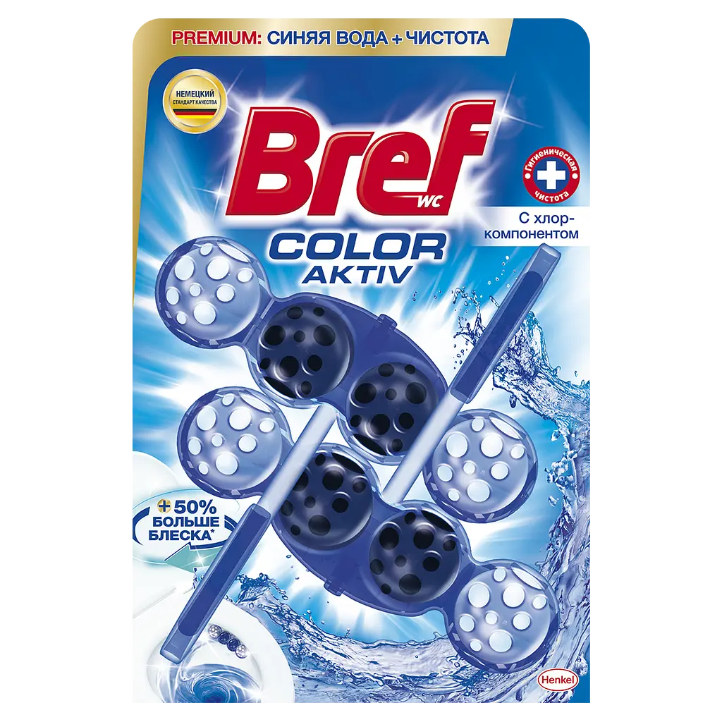 Туалетный блок для унитаза Bref (Бреф) Color aktiv с хлор-компонентом с эффектом цветной воды придает больше блеска поверхности и обладает технологией нейтрализации запаха.