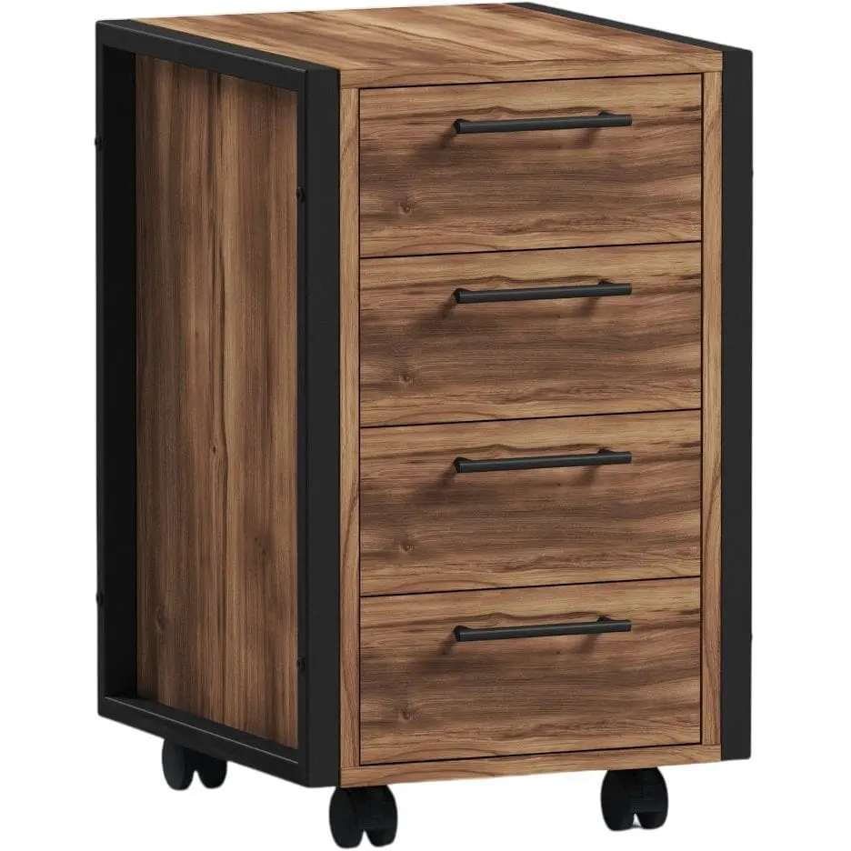 Тумба мобильная Лофт ОП-451 Orange-Line компактных размеров 45х40х65 см станет незаменимым помощником для организации рабочего пространства. Конструкция из ДСП под дуб барокко ристретто с черными акцентами создает современный индустриальный вид, характерный для стиля лофт. Четыре выдвижных ящика обеспечивают достаточно места для хранения документов, канцелярских принадлежностей и личных вещей. Каждый ящик оснащен удобными ручками и надежными выдвижными механизмами, что гарантирует долговременное и бесперебойное использование. Главным преимуществом модели является мобильность благодаря роликам для перемещения, позволяющим легко передвигать тумбу по офису или кабинету без труда. Ролики обеспечивают плавное скольжение по разным типам полов и не оставляют следов. Компактные габариты делают тумбу идеальной для небольших офисных помещений, домашних кабинетов или в качестве дополнительного элемента хранения у рабочего стола. Напольное помещение позволяет установить тумбу в любом удобном месте. Практическое решение для офисного использования совмещает функциональность с эстетической привлекательностью. Тумба легко дополняет мебель в стиле лофт или становится самостоятельным акцентом в интерьере. Прочная конструкция ДСП гарантирует устойчивость к ежедневному использованию и сохраняет первоначальный вид в течение длительного времени.