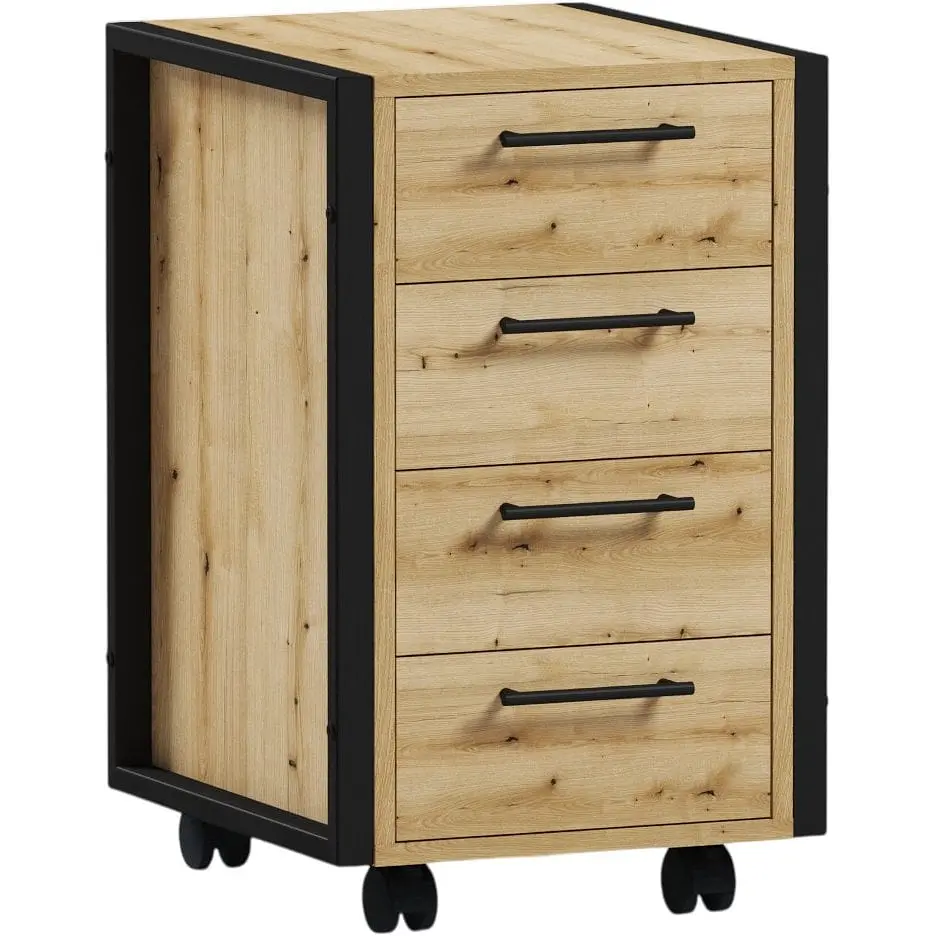 Тумба мобильная Лофт ОП-451 Orange-Line компактных размеров 45х40х65 см станет незаменимым помощником для организации рабочего пространства. Конструкция из ДСП под дуб эвок с черными акцентами создает современный индустриальный вид, характерный для стиля лофт. Четыре выдвижных ящика обеспечивают достаточно места для хранения документов, канцелярских принадлежностей и личных вещей. Каждый ящик оснащен удобными ручками и надежными выдвижными механизмами, что гарантирует долговременное и бесперебойное использование. Главным преимуществом модели является мобильность благодаря роликам для перемещения, позволяющим легко передвигать тумбу по офису или кабинету без труда. Ролики обеспечивают плавное скольжение по разным типам полов и не оставляют следов. Компактные габариты делают тумбу идеальной для небольших офисных помещений, домашних кабинетов или в качестве дополнительного элемента хранения у рабочего стола. Напольное помещение позволяет установить тумбу в любом удобном месте. Практическое решение для офисного использования совмещает функциональность с эстетической привлекательностью. Тумба легко дополняет мебель в стиле лофт или становится самостоятельным акцентом в интерьере. Прочная конструкция ДСП гарантирует устойчивость к ежедневному использованию и сохраняет первоначальный вид в течение длительного времени.