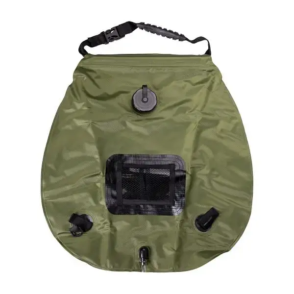 Портативная душевая сумка для кемпинга оснащена крепкой ручкой для надежного подвешивания и переноски. Встроенный термометр на задней части сумки позволяет контролировать температуру воды. Передняя часть содержит карман, рассчитанный на хранение мыла, шампуня и других банных аксессуаров.