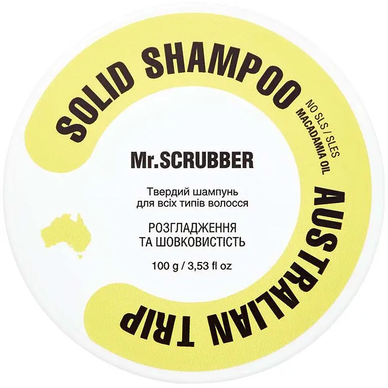 Твердый шампунь Mr.Scrubber Australian Trip хорошо пенится, тщательно очищает и устраняет сухость, тусклость и ломкость волос. Укрепляет волосяные луковицы, избавляет от перхоти, предупреждает возникновение седины.