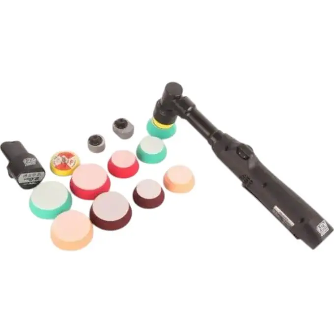 В комплекте: длинная угловая полировальная аккумуляторная минимашинка Polisher, с вращательным или вращательно-орбитальным типом движения подошвы.