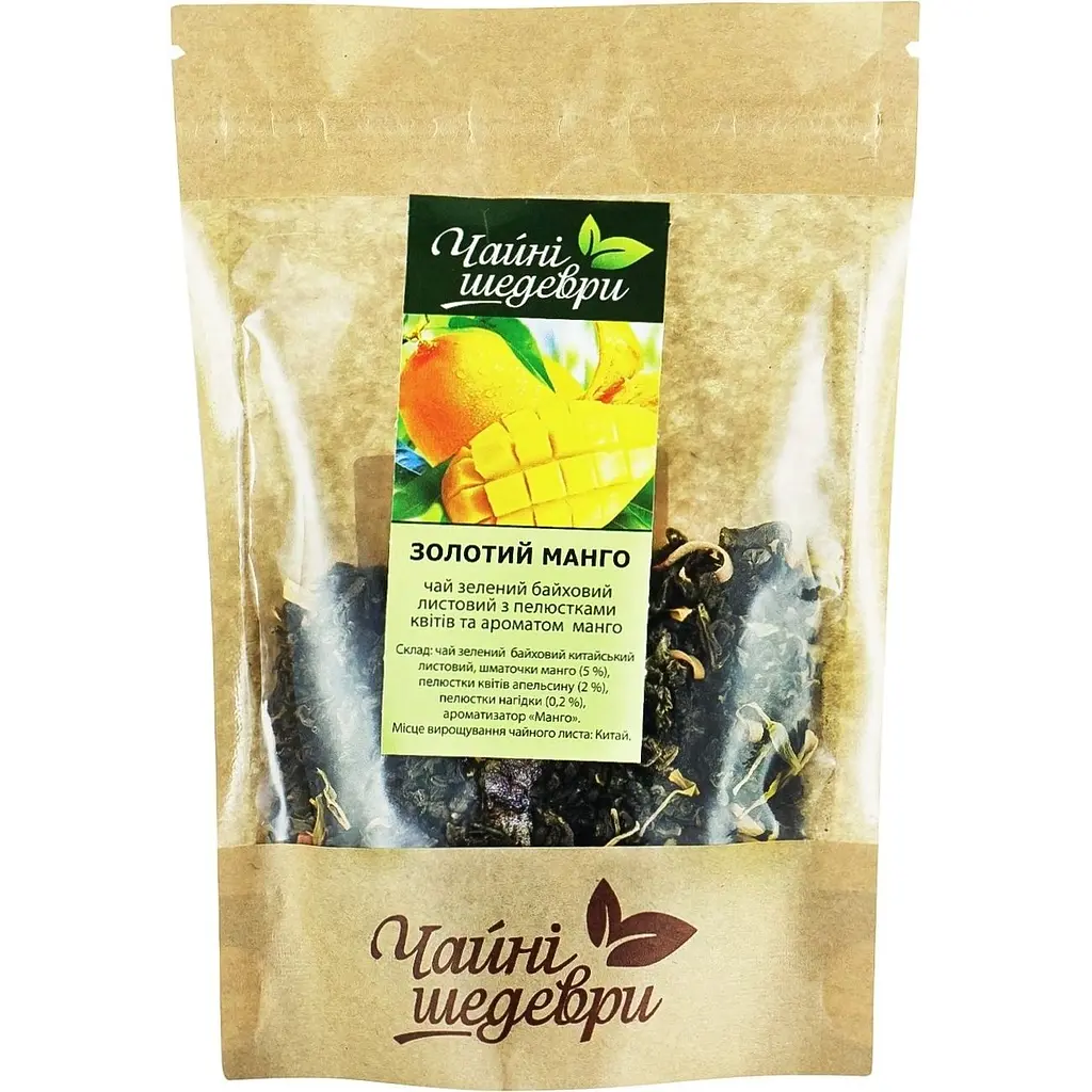 Чай зеленый Чайні шедеври Золотой манго создан на основе зеленого китайского чая с добавлением кусочков манго, лепестков апельсина и цветов.