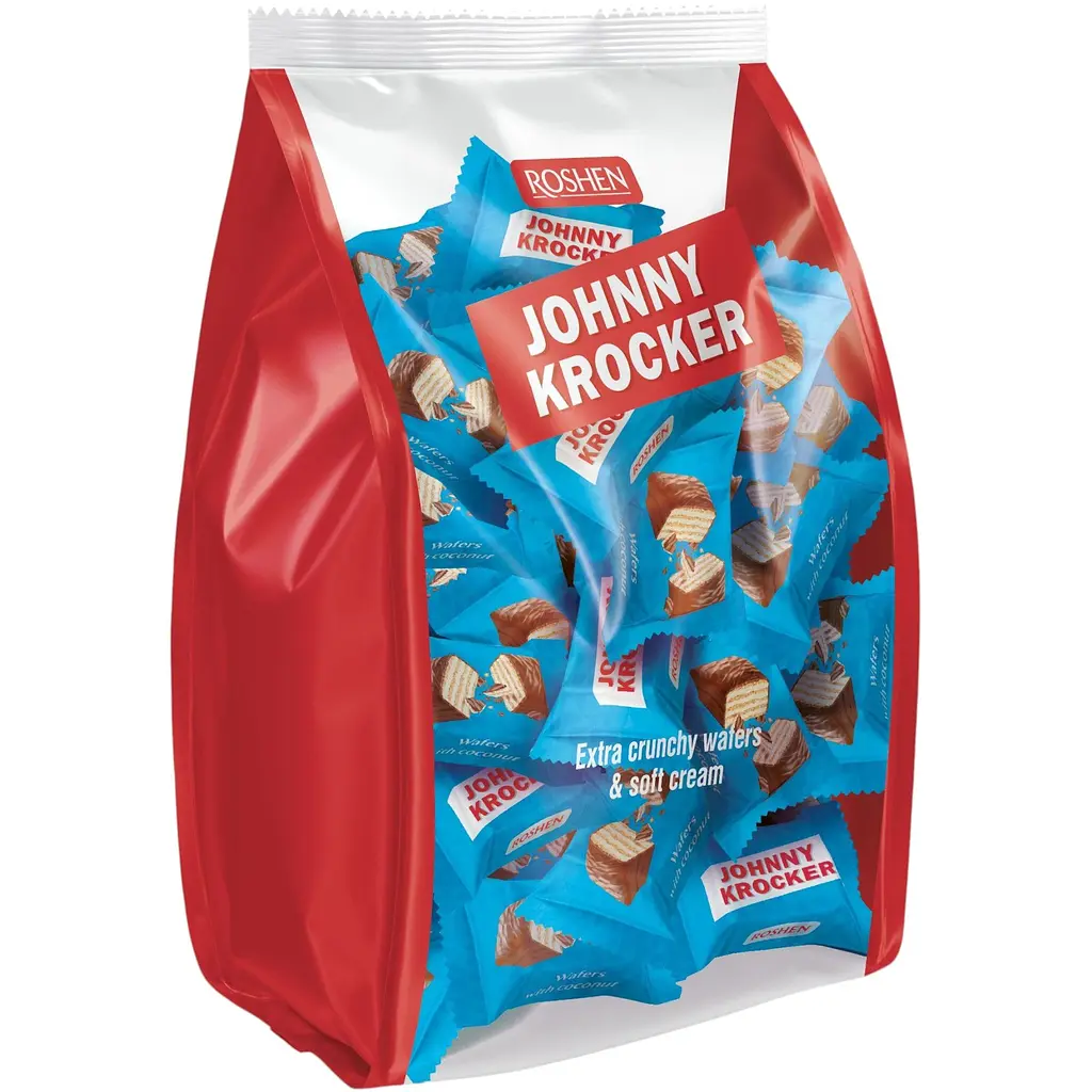 Вафлі Roshen Johnny Krocker coconut можна назвати цукерками. В кілограмовій упаковці їх досить багато, вафлі повітряні та хрусткі, начинка не занадто солодка, аромат кокоса відчувається одразу. Вкриті шоколадною глазур'ю хорошої текстури та смаку, не залипають а хрумотять. Акційна ціна - ще один плюс. Дякую!