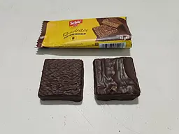 Смачні вафлі в темній шоколадній глазурі. Хрусткі, добре смакують з кавою. В пакуванні на 40 г дві вафлі. З мінусів – наявність пальмової олії в складі та висока ціна за маленьке пакування.