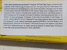 Темный шоколад 42% (сахар, какао тертое, какао-масло, эмульгатор: соевый лецитин (Е-322); натуральный ароматизатор), картофельный крахмал, сахар, растительные жиры (пальма, пальмоядро), какао 5%, фундук 2%, соев (Е-322); загуститель: гуаровая камедь (Е-412); разрыхлитель: натрия гидрокарбонат (Е-500), обезжиренное порошковое молоко. Продукт может также содержать следы миндаля.