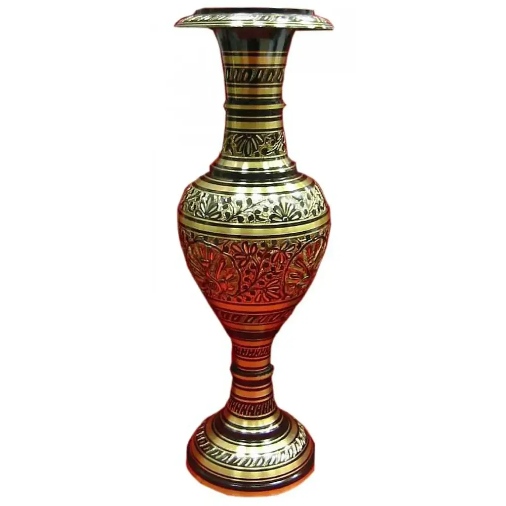 Ваза имеет универсальную высоту, что позволяет использовать ее для создания цветочных композиций или как самостоятельный декоративный элемент. Ее теплый металлический оттенок придает интерьеру ощущение роскоши и благородства, гармонично сочетаясь со стилями классики, модерна или винтажа.