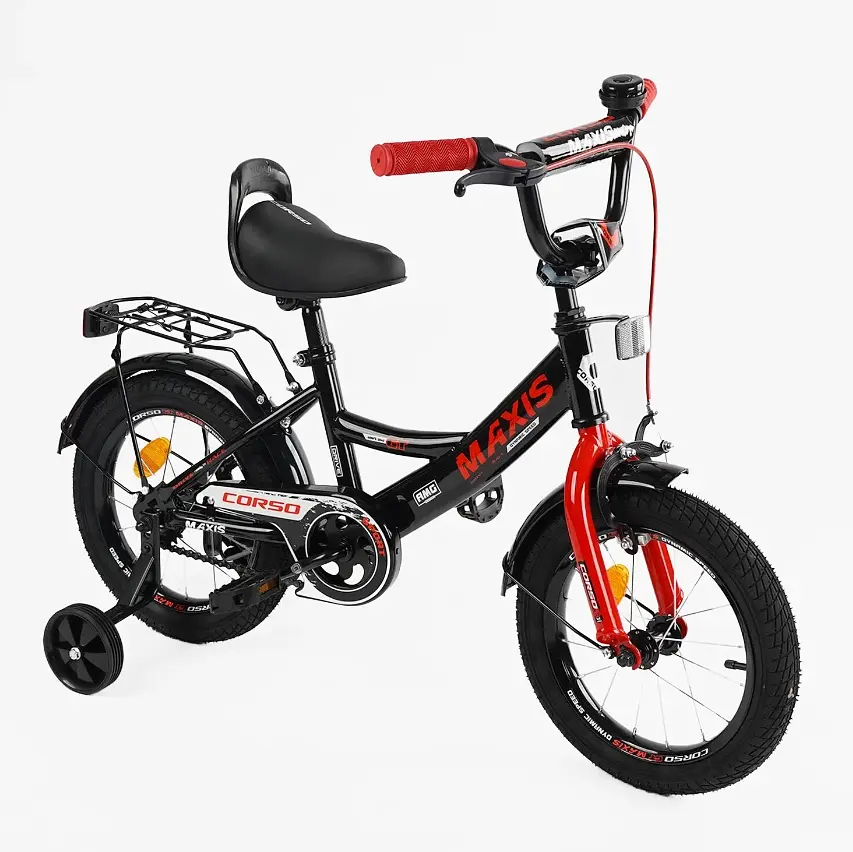 Детский двухколесный велосипед "Corso 14" предназначен для юных велосипедистов! Новый дизайн велосипеда, его комплектация и надежная конструкция совершат прогулки на свежем воздухе активными и безопасными. Конструкция велосипеда изготовлена из прочного стального сплава, который не даст его раме деформироваться и обеспечит ее стойкостью к повреждениям. Рама представленной модели с заниженной конструкцией делает ее более удобной для ребенка. Малыш без проблем сможет сесть на велосипед и встать с него. Колеса "Corso 14" с надувной камерой на металлических дисках со спицами. Над каждым колесом установлены металлические крылья. Они помогут предотвратить разбрызгивание грязи и воды и защитят ребенка и сам велосипед от загрязнений. Руль и сиденье велосипеда регулируется по высоте, что позволит подобрать оптимальный размер для каждого ребенка индивидуально. Ручки руля с резиновыми нескользящими накладками. Безопасность во время катания обеспечат металлический защитный щит на цепи велосипеда, мягкая накладка на его руле, а также несколько светоотражающих катафотов. "Corso 14" оборудован передним ручным и задним ножным тормозом. Специально для неуверенных велосипедистов эта модель комплектуется двумя съемными страховочными колесами из пластика и небольшой ручкой на сиденье. Дополнительно велосипед оборудован металлическим багажником с зажимом, а также механическим звонком на руле. Характеристики: - возраст: 4-5 лет, рост: 90-105 см; - диаметр колес: 14; - Каретка: American (Американка); - Велосипед собран на 75%. Масса Нетто: 9,4 кг. Масса Брутто: 10,6 кг. Упаковка: коробка
