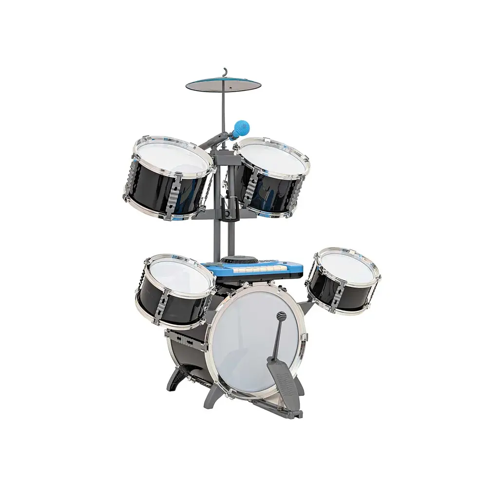 Эта большая барабанная установка с клавиатурой и микрофоном идеально подходит для маленьких музыкантов! Изготовленная из безопасных и качественных материалов, она имеет реалистичный вид профессионального инструмента. В комплект входят пять барабанов, тарелка, набор палочек, микрофон, клавиатура и табурет. Клавиатура оснащена многими интересными функциями, такими как микшер, предварительно загруженные мелодии, демо-версии, возможность записи и воспроизведения, а также микрофон и вход MP3. Это помогает детям развивать музыкальные навыки и учит их различать звуки. Клавиатура питается от 4 батареек типа АА 1,5 В (входят в комплект).