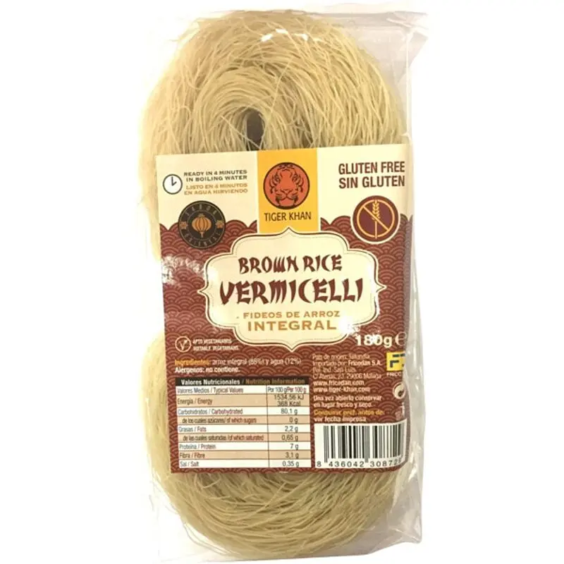 Вермишель рисовая коричневая Tiger Khan - отличный выбор для тех, кто желает наслаждаться вкусной азиатской кухней без глютена.