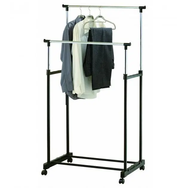 Стойка-вешалка для одежды двойная на колесиках изготовлена из стальных трубок покрытых хромом и черной краской. Стойка регулируется по высоте с помощью зажимов. Собирается очень легко, не требуется никаких инструментов.