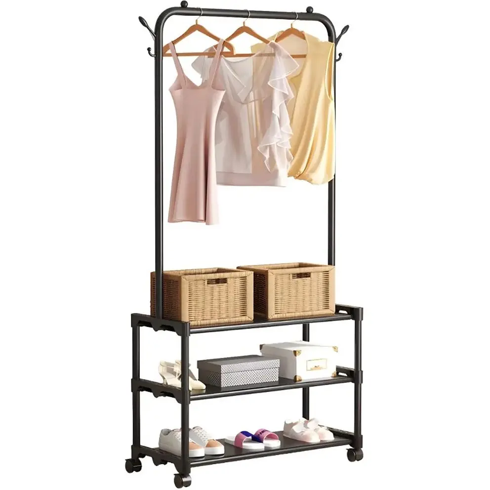 Вешалка-стойка для одежды Stenson с полками для обуви станет отличным решением для компактного размещения вещей и обуви в квартире, особенно если пространство ограничено. Она достаточно вместительна, чтобы обеспечить аккуратное и удобное хранение ваших предметов гардероба и обуви.