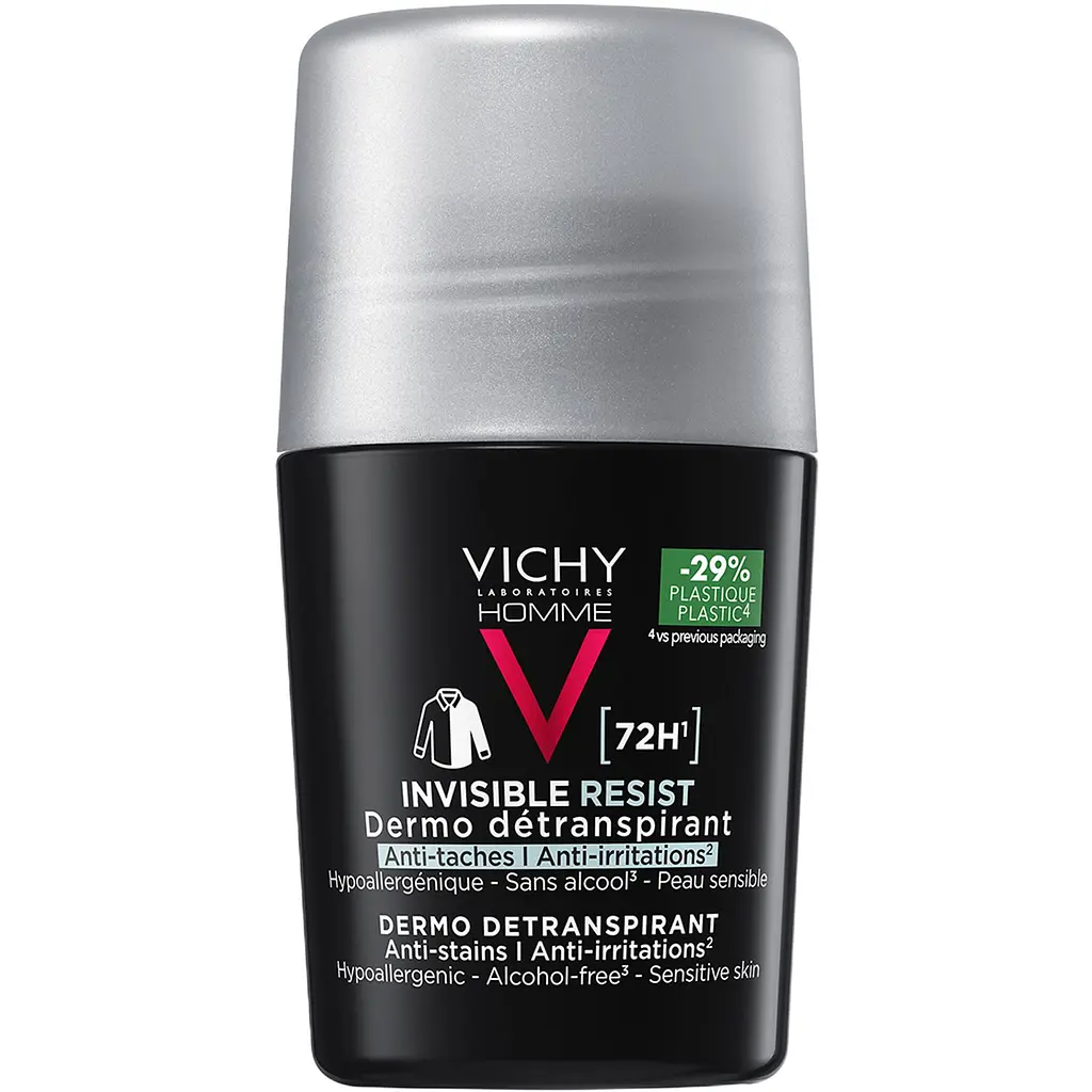 Дезодорант Vichy Homme Invisible Resist для мужчин обеспечивает высокий уровень защиты от пота, запаха и обеспечивает защиту против желтых и белых пятен на одежде в течение 72 часов после использования. Он создан на основе новой запатентованной технологии INVISI-LOCKTM, образующей ультратонкое покрытие, незаметно высыхающее и не оставляющее следов на одежде.