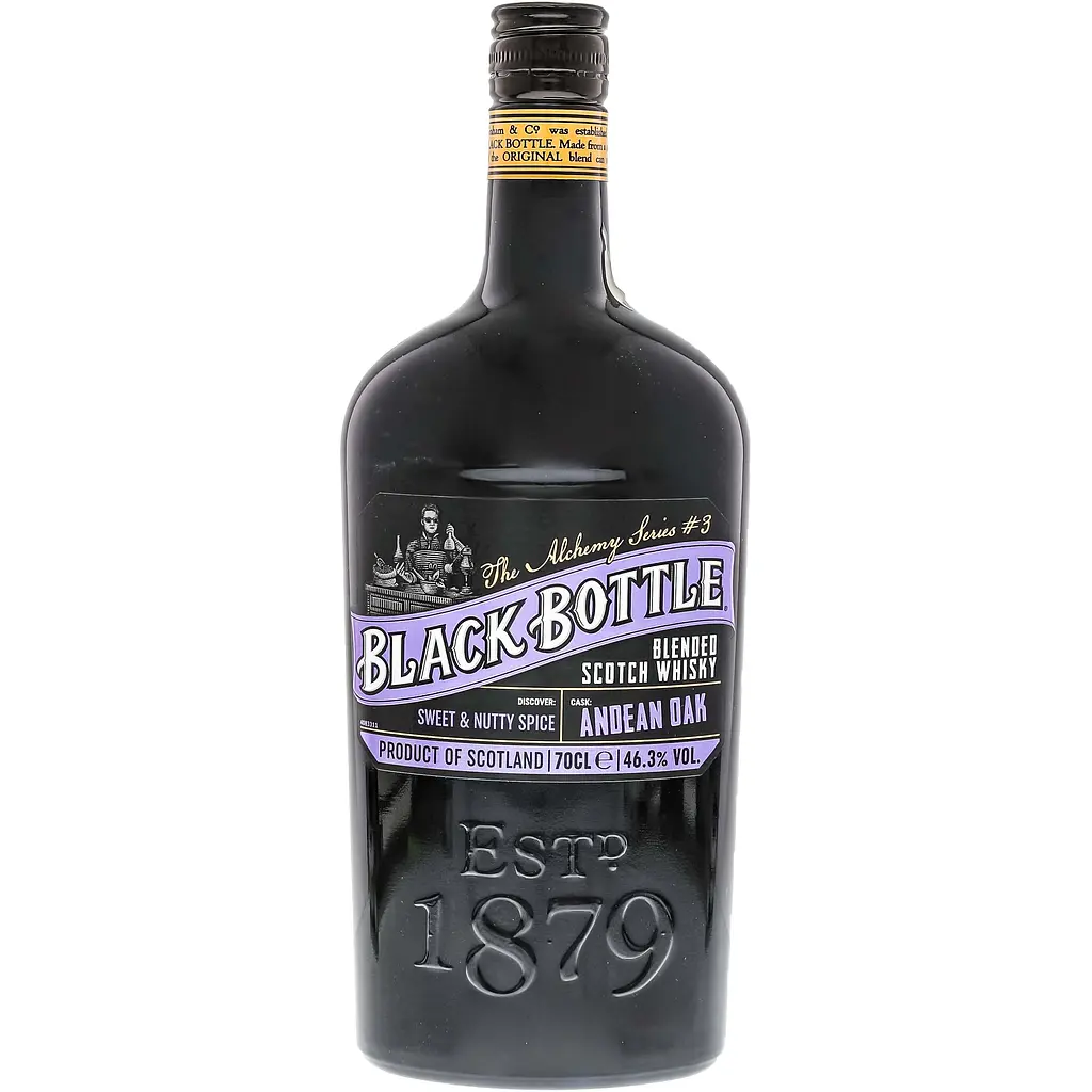 Black Bottle - это уникальный виски, в купаж которого входят односолодовые виски из всех семи винокурень, которые расположены на знаменитом шотландском острове Айла. Виски производится методом двойной дистилляции и выдерживается в дубовых бочках минимум 5 лет. Виски был создан Гордоном Грэмом в 1879 году. До 1914 года виски продавался в черной бутылке, черное стекло поставлялось из Германии, но со времен начала Первой мировой войны традиция изменилась, виски без винтажа стал выпускаться в бутылке из зеленого стекла, а бутылки с 10-летним виски покрываются черным пластиком, что создает вид настоящей черной бутылки. В 2005 и 2006 годах напиток был удостоен звания "Лучший смешанный скотч виски" от Джима Мюррея, "Библия виски".