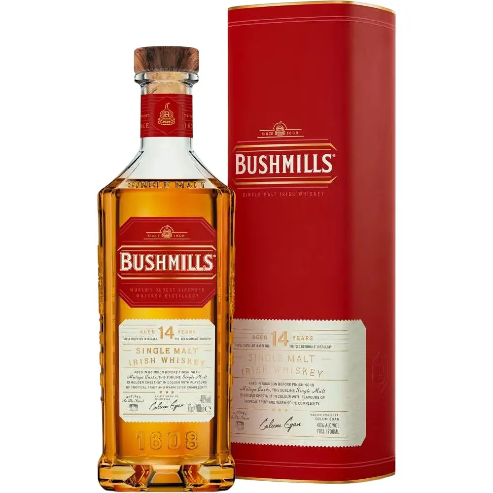 Bushmills 14 Years Old Malaga Casks Finish - это ирландский односолодовый виски, который выдерживался в бочках из-под бурбона в течение 13 лет, а последние 12 месяцев - в бочках из-под вина Малаги. Малага - это сладкое десертное вино, которое производится вблизи города Малага в Испании. Вино изготавливается из обезвоженного винограда сортов Педро Сименес и Мускат де Александрия. Трехкратная дистилляция, характерная для ирландского виски, делает напиток чрезвычайно деликатным и мягким на вкус.