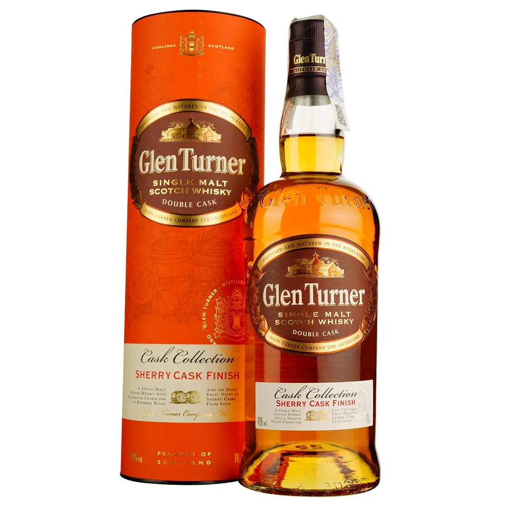 Перша витримка віскі Glen Turner Sherry Cask триває протягом трьох років у бочках з-під бурбона. Після дистилят вирушає в молоді бочки з-під хересу Олоросо, де проводить ще 12 місяців. Аромат віскі наповнений відтінками солодких спецій, ірисок, мигдалю та деревини. Чудовий, елегантний смак з тонами горіхів, червоних сухих ягід, тютюнового листа. Тривалий післясмак з відтінками дуба та карамелі. Рекомендую!
