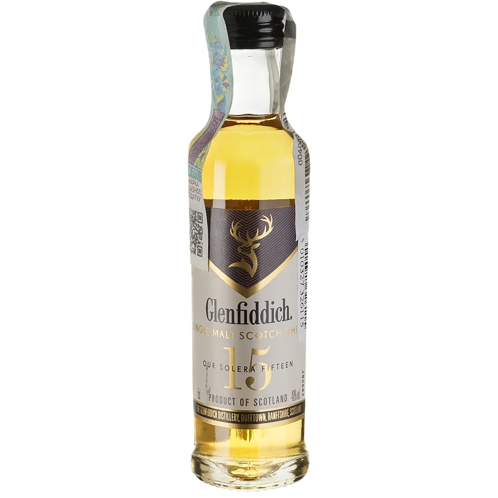 Виски Glenfiddich (Гленфиддиш) Single Malt Scotch,15 лет- богатый односолодовый виски 15-летний выдержки, который созревает в трех типах дубовых бочек: из-под бурбона, хереса и нового дуба. Затем напиток перемещается в уникальную, сделанную вручную бочку The Glenfiddich Solera Vat. Особенность выдержки в этой бочке заключается в том, что Solera Vat никогда не бывает пустой, уровень виски не опускается менее чем на половину.