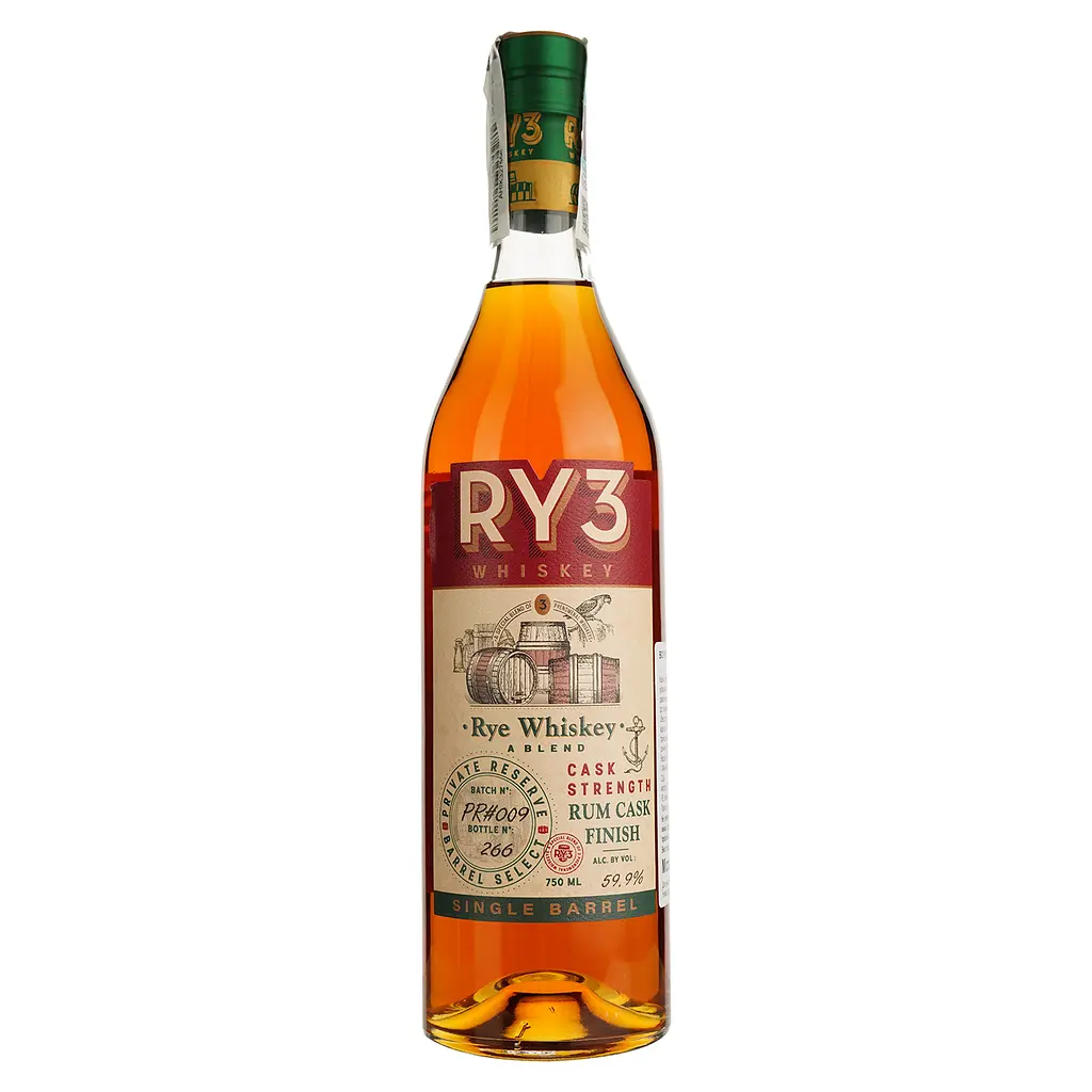 Виски RY3 Cask Strength имеет глубокий золотисто-янтарный цвет с искрящимися медовыми бликами. Аромат сложен и интенсивный, с доминирующими нотами ванили, дуба и карамели, которые дополняются нюансами специй, сушеных фруктов и легким дымным оттенком. Вкус богат и многогранен: сначала раскрывается наслаждение меда и сливочной ириски, затем нарастают пряные акценты черного перца и корицы, а финал удивляет продолжительным привкусом с нотами шоколада, жареных орехов и дубовой терпкости.