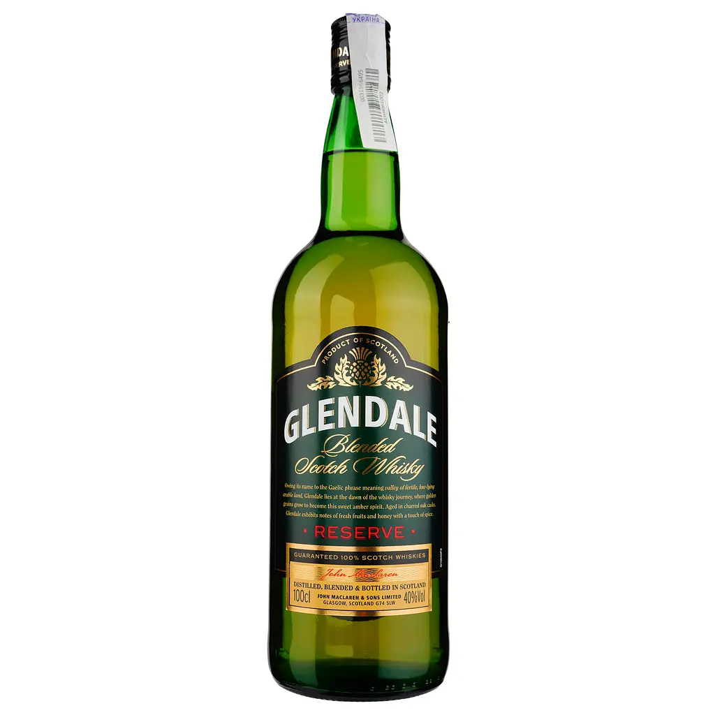 Виски шотландский Glendale Reserve 3 года Blended янтарного цвета. Аромат сложный, насыщенный, открывается сначала нотами груши, торфяного дыма и хереса. Впоследствии в нем появляются ноты фруктов и патоки. Вкус мягкий, густой, насыщенный, в котором после добавления нескольких капель воды начальная сладость и дымные оттенки сменяются свежими фруктовыми нотами. В длительном послевкусии нюансы сливочных ирисок, солода и карамели.