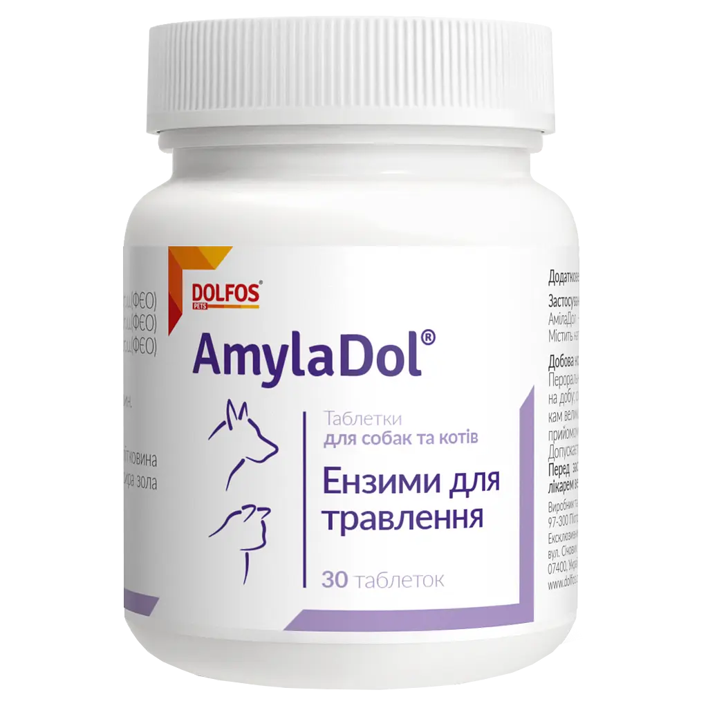 Dolfos AmylaDol - кормовая добавка для собак и кошек, содержащая натуральные ферменты пищеварения, которые обеспечивают переваривание жиров, углеводов и протеинов. Рекомендуется для животных больных и склонных к заболеванию панкреатитом. Показан при различных типах нарушений пищеварения, воспалении поджелудочной железы и как монотерапия при синдроме мальдигестии (тошноты, отрыжка, дискомфорт в абдоминальной области, метеоризмы, диарея).
