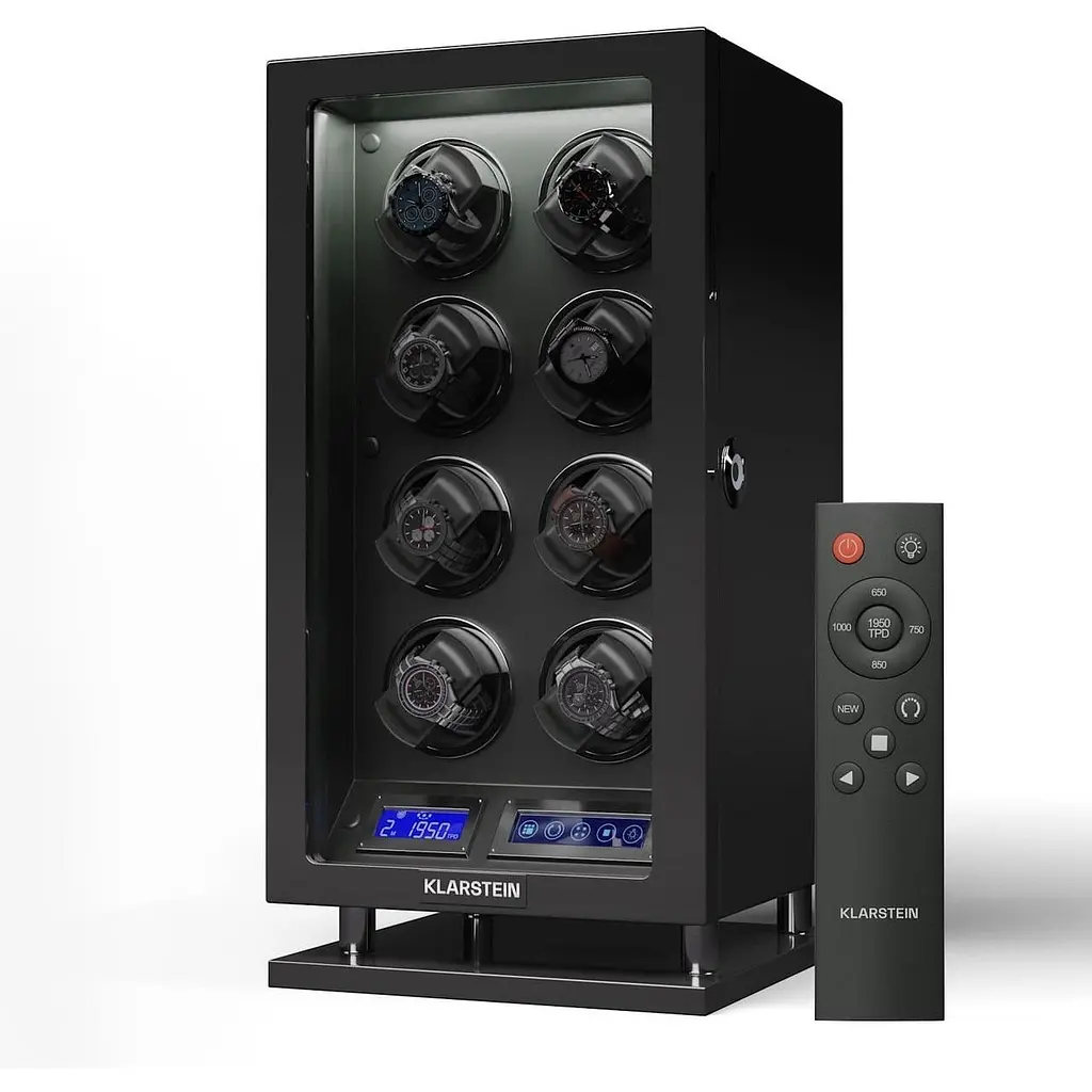 Среди главных особенностей - запирающаяся дверца с акриловым окошком, встроенное светодиодное освещение для изысканной демонстрации ваших часов, бесшумная работа двигателя с уровнем шума менее 5 дБ и сенсорный ЖК-экран с пультом дистанционного управления для максимального удобства использования. Подзавод Часов Klarstein Verdon 8 предлагает место для хранения до 8 часов и имеет гибкие подставки для часов разных размеров. Он не только обеспечивает безопасное хранение, но и стильно дополняет вашу ценную коллекцию часов. Для дополнительной безопасности замок открывается только отпечатком пальца.