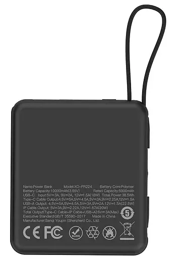 Кроме того, павербанк XO PR224 10000 mAh 22.5W Black имеет средний вес и скромные размеры - 75x66x25.5 мм, что позволяет легко носить его в рюкзаке.