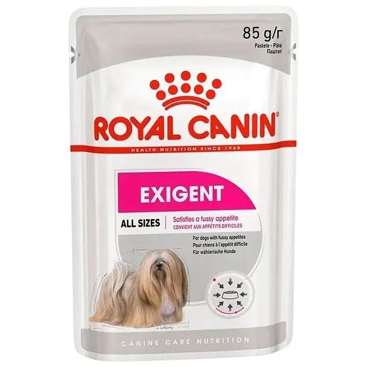 Влажный корм для взрослых собак Royal Canin Exigent – сбалансированное питание при особых потребностях организма.