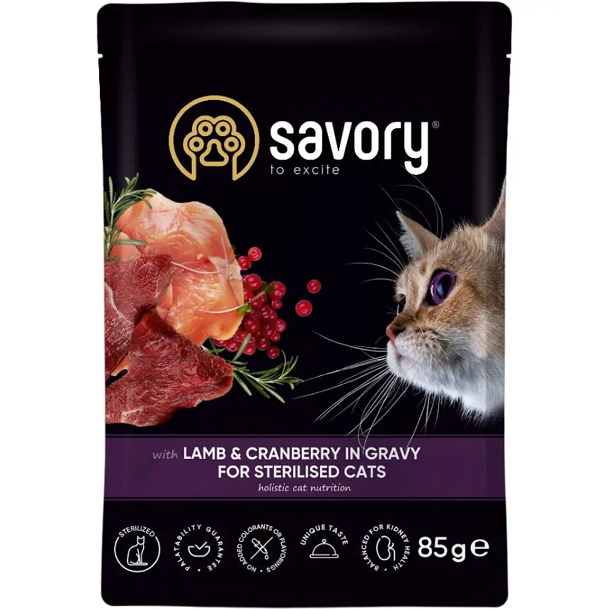 Нашої кішечці дуже сподобався Savory з ягням і журавлиною в соусі. Їсть із задоволенням, соус м’який і смачний, маленькі шматочки ягня. Зручна упаковка-пауч 85 г якраз на одну порцію. Можу сказати, що економно.