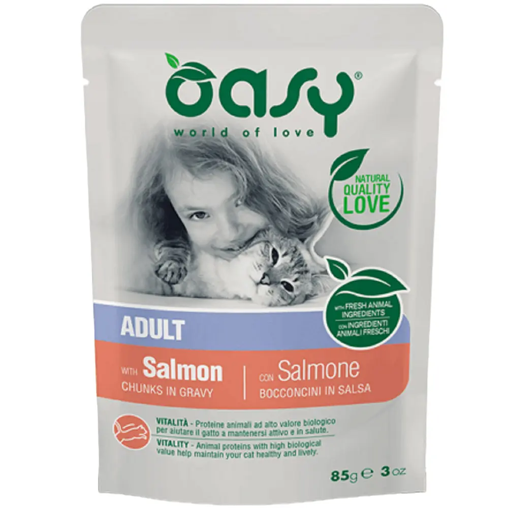 Полнорационный корм для взрослых кошек Oasy Adult с лососем создан с заботой к вашему любимцу. Мягкие кусочки в подливе, созданные для вашего взрослого кота, чтобы радовать его каждый день. Приготовлены с большим количеством животных белков, без добавления глютена, искусственных ароматизаторов и красителей. Животные белки с высокой биологической ценностью помогают поддерживать здоровье и энергичность кота.