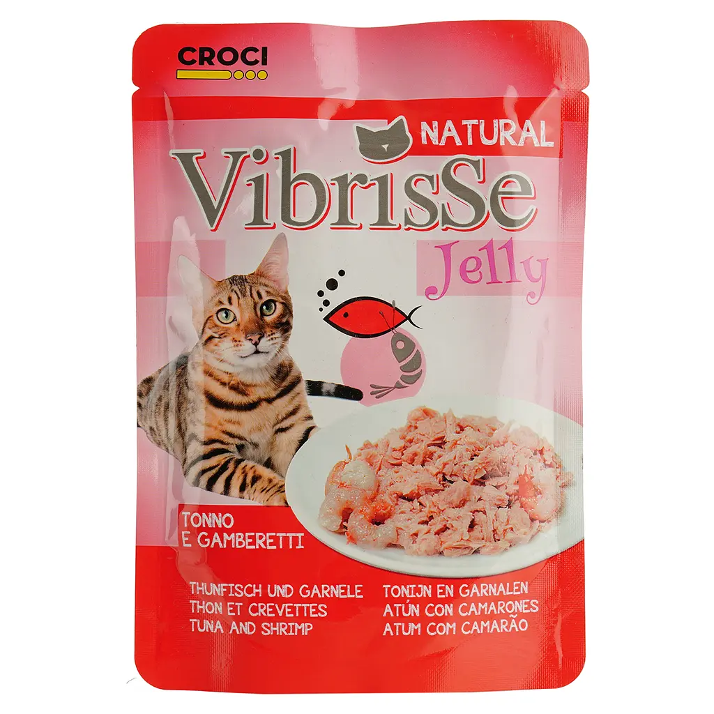 Влажный корм для кошек Vibrisse Jelly Тунец и креветки в желе - аппетитное паровое блюдо из отборных ингредиентов, приготовленных в собственном соку по уникальной итальянской рецептуре.