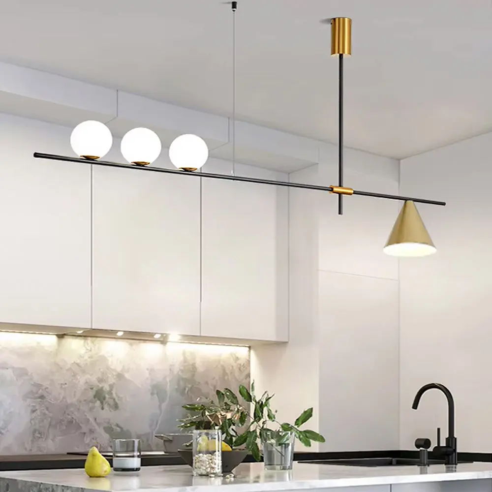 Подвесная люстра в современном стиле станет эффектным акцентом в любом интерьере. Конструкция выполнена в минималистическом дизайне: черный металлический каркас с латунными деталями придает изысканность, а сочетание разных геометрических форм создает гармоничный баланс. С одной стороны люстры расположен конический металлический абажур, с другой - три матовых белых плафона диаметром 10 см, равномерно рассеивающих свет. Длина корпуса - 122 см, что позволяет осветить большую площадь, а регулируемая высота (от 50 до 75 см) обеспечивает адаптацию к разным помещениям. Люстра работает с четырьмя лампами формата G9, что гарантирует достаточный уровень освещения. Эта модель идеально подходит для современных интерьеров: от минимализма и скандинавского стиля до лофта и модерна. Оптимальное применение - обеденные зоны, кухонные острова, гостиные или креативные рабочие просторы, где требуется стильное и функциональное освещение. Количество источников света: 20 Серия: MJ 87 Цвет основы: Черный Цвет плафона: Белый Цвет фурнитуры: латунь Расстояние между точками крепления: 50 см Размер потолочной основы: 10х7 см Максимальная высота: 75 см Минимальная высота: 50 см Тип цоколя: G9 Размер плафона: 10 см Материал основы: Металллл Размер монтажной планки: 7 см Тип крепления: Монтажная планка и трос