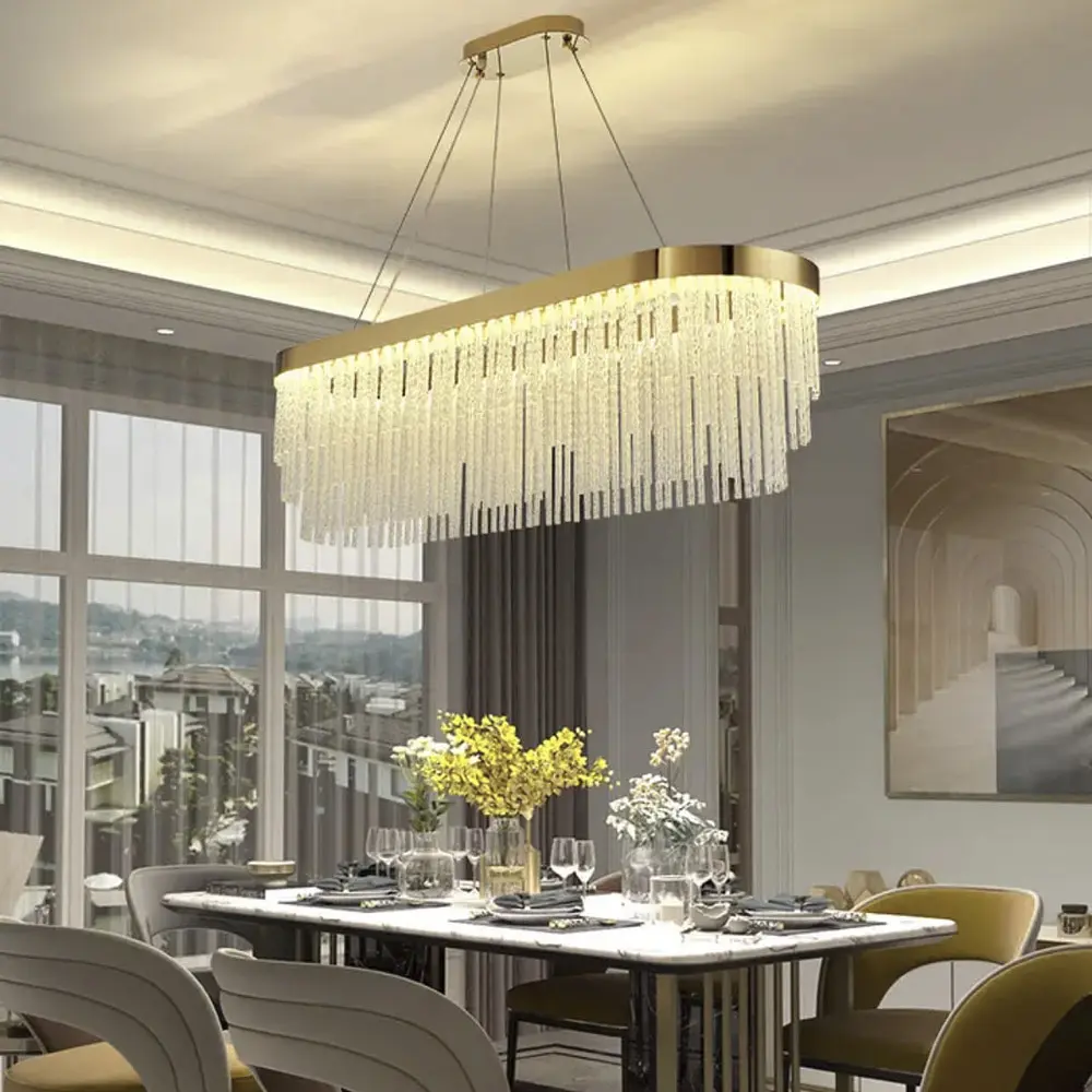 Изысканная подвесная LED люстра в латунном корпусе станет роскошным акцентом в современном интерьере. Ее элегантный и современный дизайн отличается вытянутой формой, которая прекрасно подходит для длинных обеденных столов, кухонных островов или просторных помещений. К металлическому латунному каркасу крепятся несколько ярусов фигурных стеклянных элементов, напоминающих изящные палочки. Прозрачные стеклянные детали эффектно рассеивают свет, создавая мягкое и роскошное освещение. Модель доступна в двух размерах: 80 и 100 см, что позволяет выбрать оптимальный вариант в зависимости от площади помещения. Встроенные LED-элементы поддерживают три режима освещения - теплое, нейтральное и холодное. Благодаря регулируемой высоте до 200 см люстра подходит как для стандартных, так и для высоких потолков. Идеальный выбор для гостиной, столовой, кухни или просторного холла. Гармонично дополнит интерьеры в стиле современной классики, арт-деко, неоклассики и минимализма, придавая пространству изысканности и сдержанной роскоши. Серия этих люстр включает два вида: круглые кольцевые модели в четырех размерах (40, 60, 80 и 100 см) и удлиненные варианты длиной 80 и 100 см, что позволяет выбрать оптимальную форму для различных типов помещений. Мощность (Вт): 27 Тип помещения: Люстры для гостиной (в зал) Форма_изделия: Прямоугольник Серия: M 221 Цвет основы: Латунь Цветовая температура: 3000–4500–6000К Максимальная высота: 200 см Минимальная высота: 35 см Материал основы: Металл Размер монтажной планки: 15 см Тип крепления: Монтажная планка