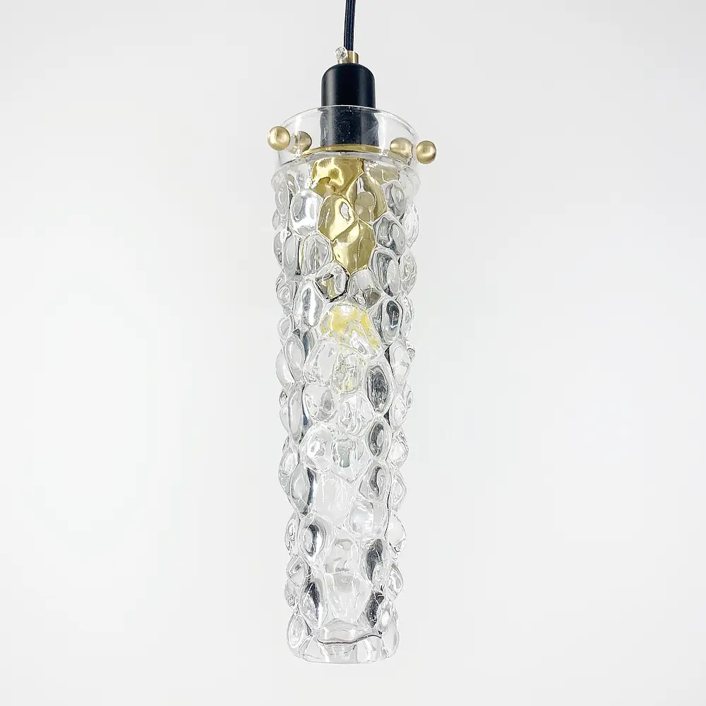Удлиненный светильник со стеклянным рельефным плафоном и золотой фурнитурой Кабель в тканевой оплетке Тип выключателя: 8 Серия: SGA 8/9/10 Цвет основы: Золотой Цвет плафона: Прозрачный Размер коробки: 35х20х15 см Вес (кг): 1.2 Максимальная высота: 200 см Минимальная высота: 35 см Тип цоколя: E14 Размер плафона: 25х8 см Материал основы: Металллл Размер монтажной планки: 10 см Тип крепления: Монтажная планка Количество источников света: 1