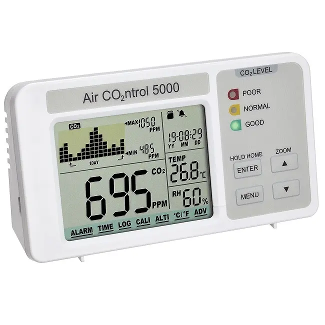 Производитель: TFA Dostmann GmbH & Co.KG, Германия Особенности: Для мониторинга концентрации CO2 в зданиях, где находятся люди, например, школы, офисы, общественные объекты Индикация уровня CO2 в виде светофора 2-канальный датчик NDIR с низким дрейфом Отображение времени, температуры и влажности в помещении График исторических значений (минута, час, день, неделя) Макс.-мин.-функция Настройка сигнала тревоги Функция логгера сохраняет более 1 миллиона записей в виде файла CSV на карте micro SD (в комплекте) Питание через кабель micro-USB (входит в комплект) Кто дышит чистым воздухом, тот здоровее, счастливее и может сделать больше. Головные боли, головокружение и постоянная усталость часто возникают из-за высокой концентрации CO2 в воздухе. С «AIRCO2NTROL 5000» от TFA вы можете следить за тем, насколько несвежим и загрязненным является воздух в помещениях, где много людей, таких как школы, офисы и общественные здания. Своевременная и энергоэффективная вентиляция обеспечивает здоровый климат в помещении. AirCO2ntrol 5000 — это монитор CO2 с функцией регистрации данных на SD-карту. Помимо уровней CO2 устройство измеряет температуру и влажность окружающей среды, а также отображает дату и время. На дисплее отображаются текущие уровни CO2, а также график с прошлыми значениями и соответствующими максимальными и минимальными значениями. Временная шкала гистограммы может быть изменена на одну минуту, час, один день или неделю. В качестве варианта последние измеренные значения температуры и влажности также могут быть четко отображены на графике. Цветной дисплей светофора позволяет быстро интерпретировать значения CO2 и меняет цвет с зеленого на желтый и на красный в зависимости от качества воздуха и настройки пороговых значений. Если указанное максимальное значение превышено, может быть дан дополнительный предупредительный сигнал, если уровни концентрации CO2 слишком высоки. Обширная функция регистрации позволяет сохранять более 1 миллиона наборов данных (CO2 / влажность / температура с датой и временем) на прилагаемой карте Micro-SD в виде файла CSV. Интервал измерения по умолчанию составляет пять секунд. Сохраненные данные можно легко и быстро проанализировать с помощью Microsoft Excel. Питание AirControl 5000 осуществляется через комплектный USB-кабель.