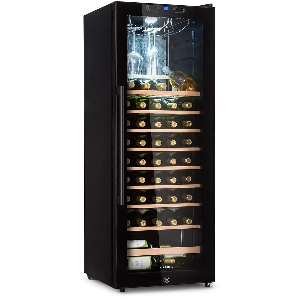 С любовью к вину: винный холодильник Klarstein Barossa 54 Uno обеспечит вам незабываемое наслаждение вином. Он доводит изысканные вина до идеальной температуры, и в нём даже можно предварительно охладить бокалы. Сенсорная панель с ЖК-дисплеем делает управление очень удобным, а бутылки безопасно хранятся на выдвижных деревянных полках.