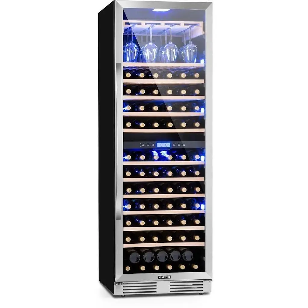 Двухзонный винный холодильник Klarstein Vinovilla Grande 165 Встроен с подсветкой для 165 бутылок вина на 12 полках из бука. Изысканные вина хранятся при правильной температуре - белые и красные вина одновременно. Вы можете получить удовольствие от охлажденного напитка, поскольку на подстаканнике можно довести до одинаковой температуры охлаждение до 24 бокалов вина.