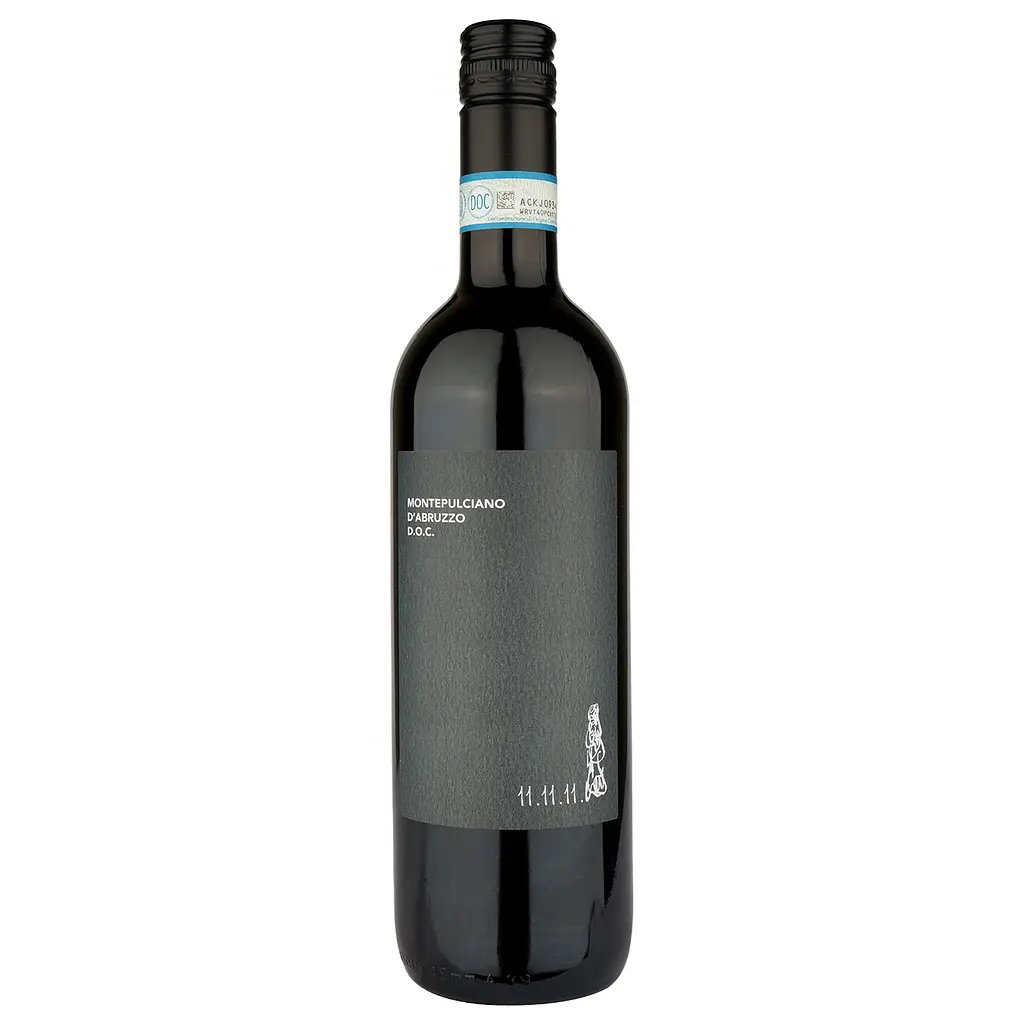 Вино 11.11.11. Montepulciano D'Abruzzo DOC демонстрирует элегантный аромат вишневого варенья с косточками, черной сливы с легким намеком на ликерные нотки и осенний подлесок. Во вкусе раскрываются черные ягоды и фрукты с шелковистыми танинами. Цвет гранатово-красный.