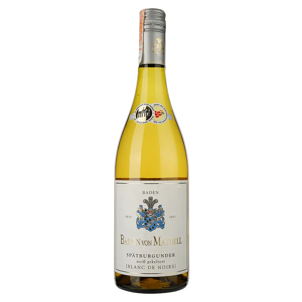 Вино Baron von Maydell (Барон фон Майдель) Spatburgunder Blanc de Noir изготовленное из винограда сорта Шпетбургундер (Пино Нуар), выращенного на лучших виноградниках в Бадене.
